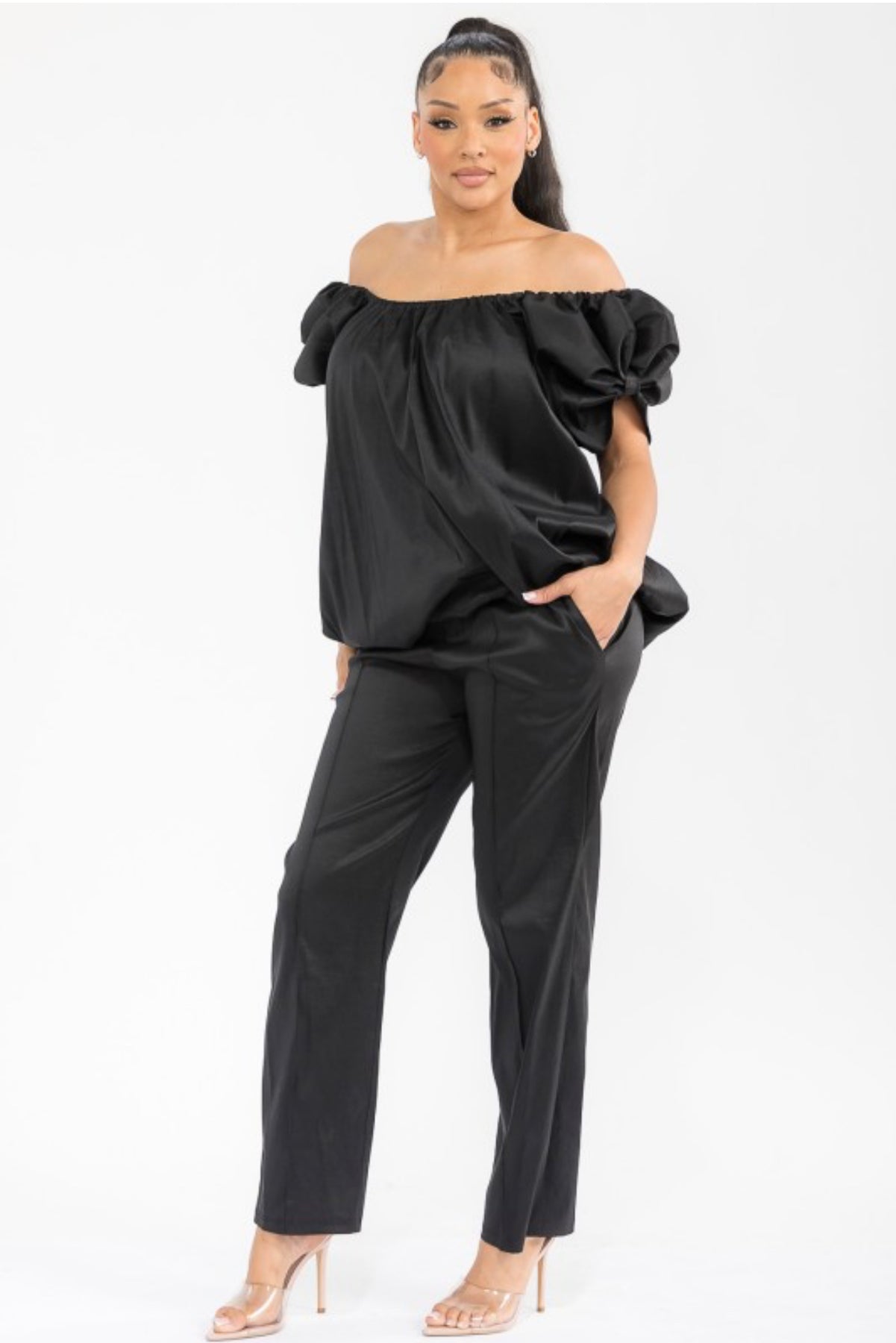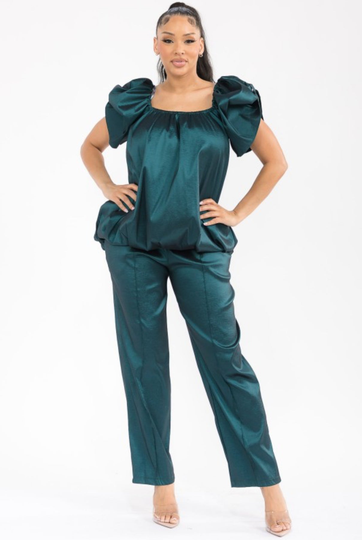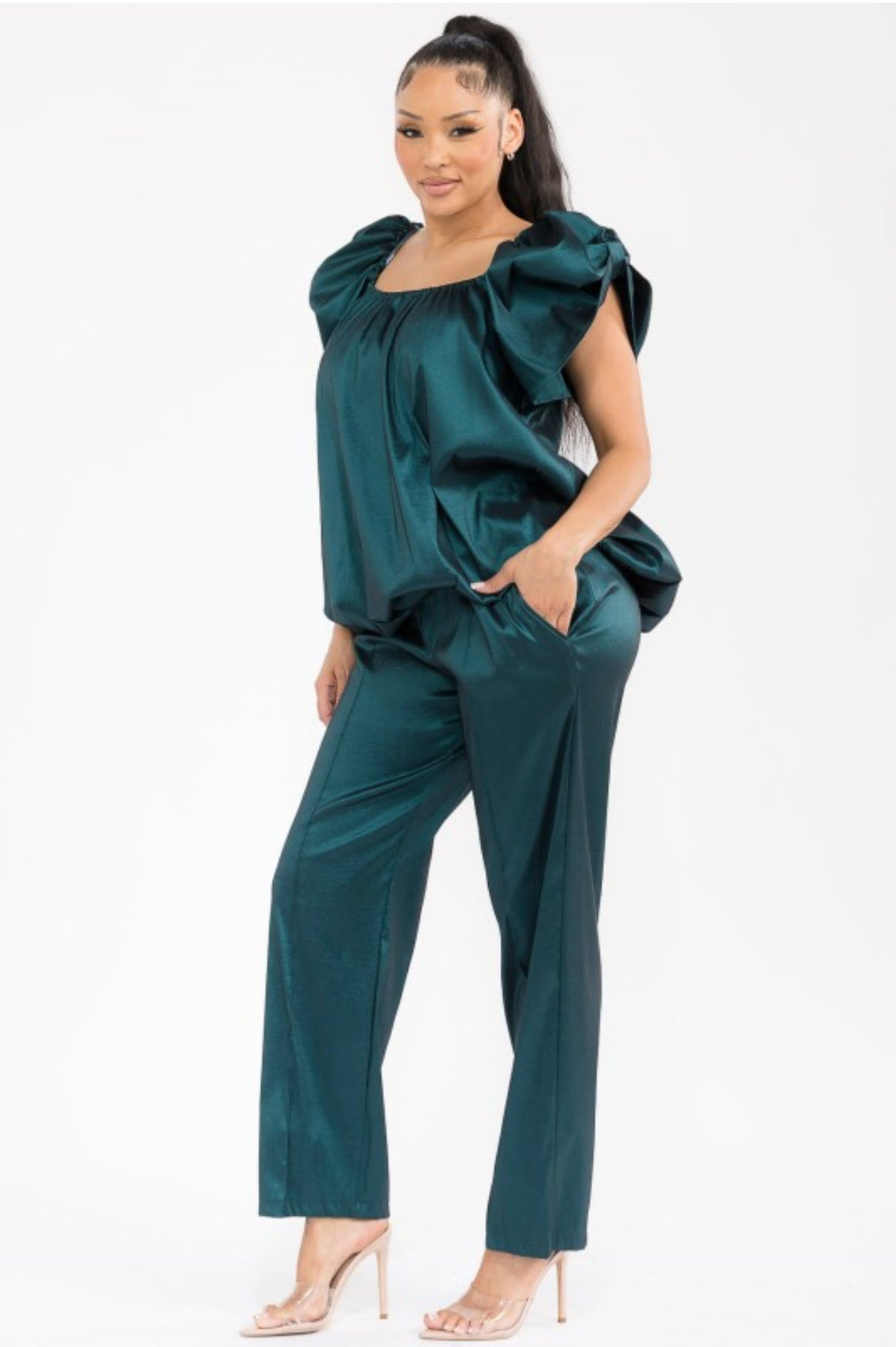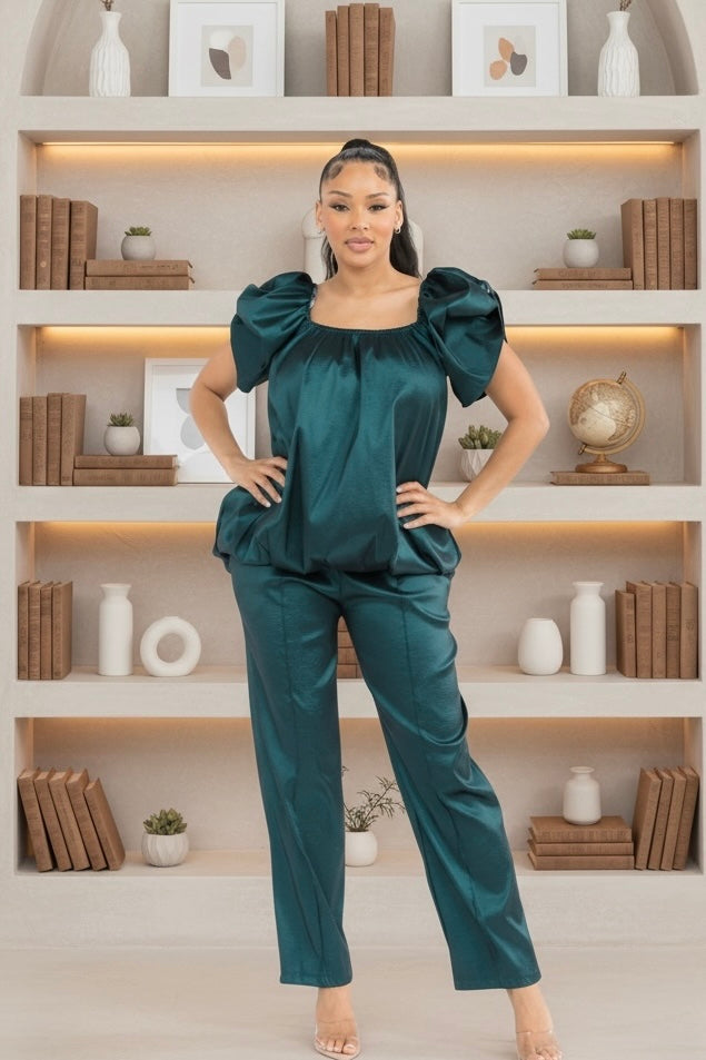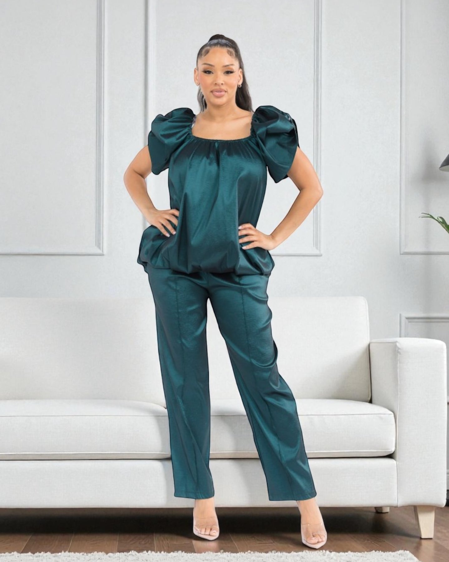 Constructed with soft satin fabric and featuring cap sleeves, this two-piece pant set is perfect for achieving a polished and elegant look. It blends comfort and style seamlessly, making it a versatile addition to any wardrobe.