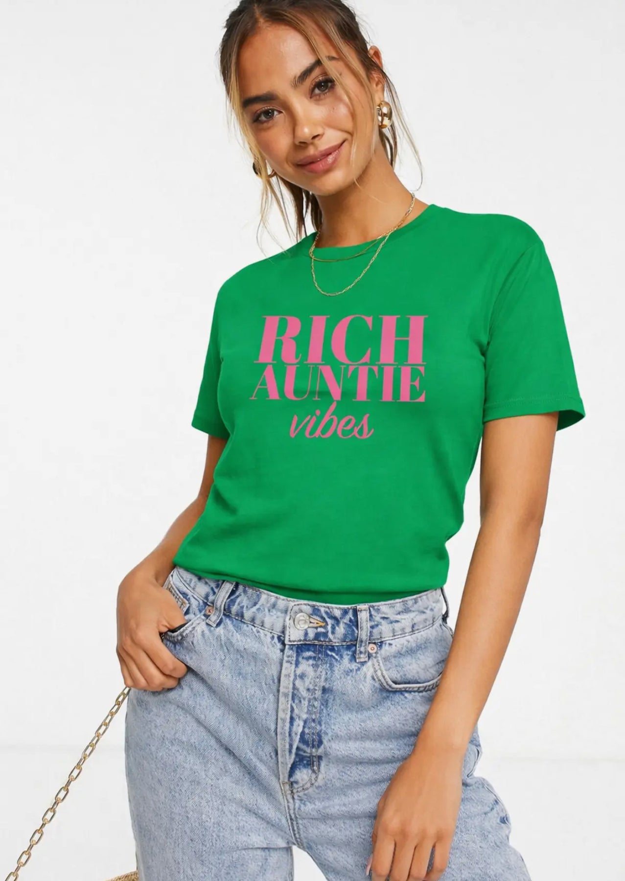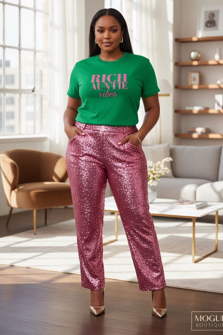 Channel luxurious "Rich Auntie vibes" with this stylish pink graphic tee. Discover your next power outfit.