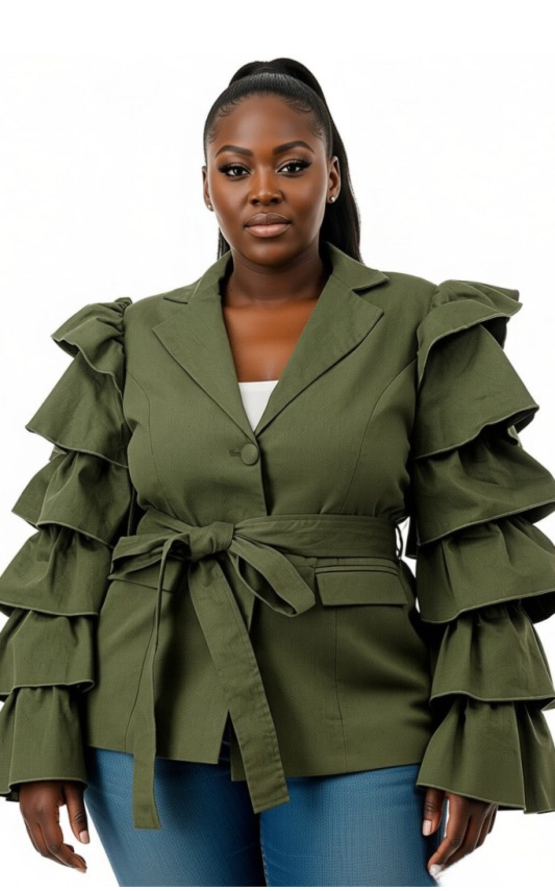 Unleash your inner fashionista with this elegant and exclusive Plus Olive Jacket. Featuring a layered ruffle design and long sleeves, this blazer exudes sophistication. The waist tie adds a touch of luxury, making it the perfect addition to any wardrobe. Upgrade your style with this Plus Olive Jacket.