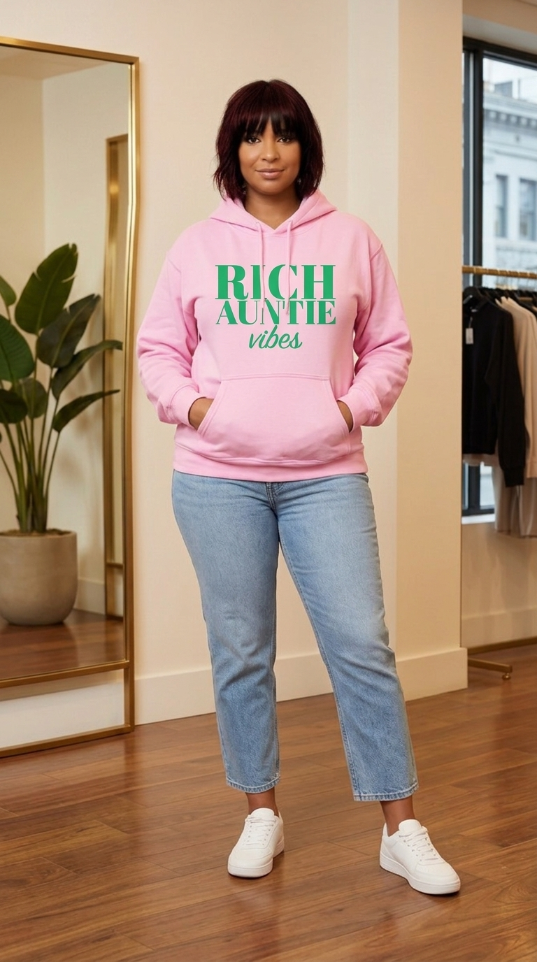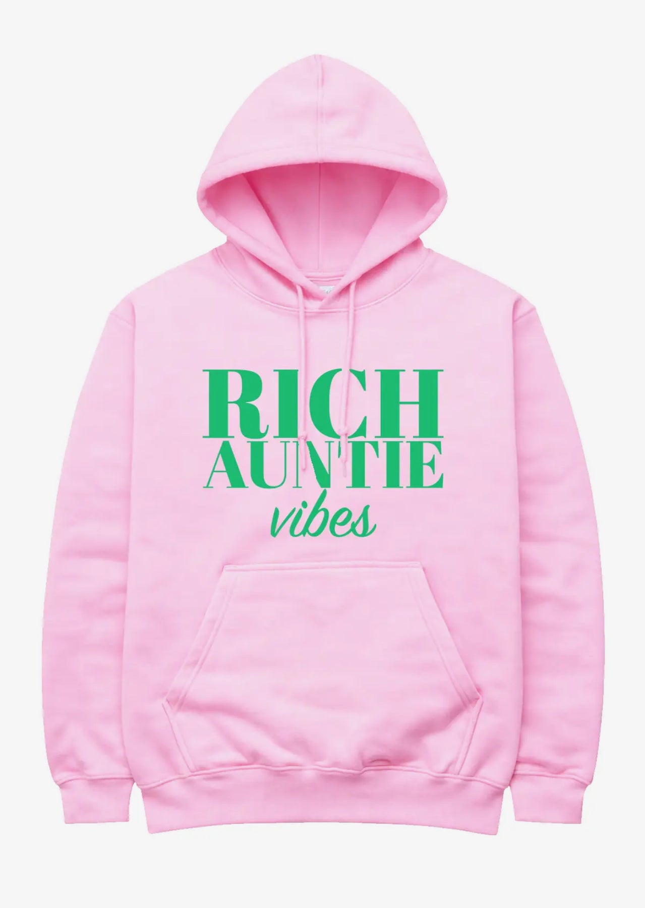 Introducing the PINK RICH Auntie Hoodie, a stylish and comfortable French terry fleece pullover made to order with a blend of 80% cotton and 20% polyester. Imported and printed in the USA, this label offers both quality and chic vibes. Stay warm and on-trend with this must-have piece.