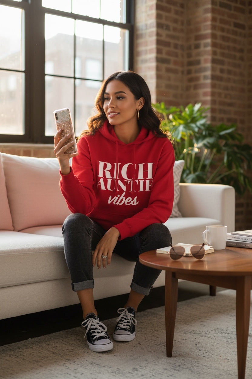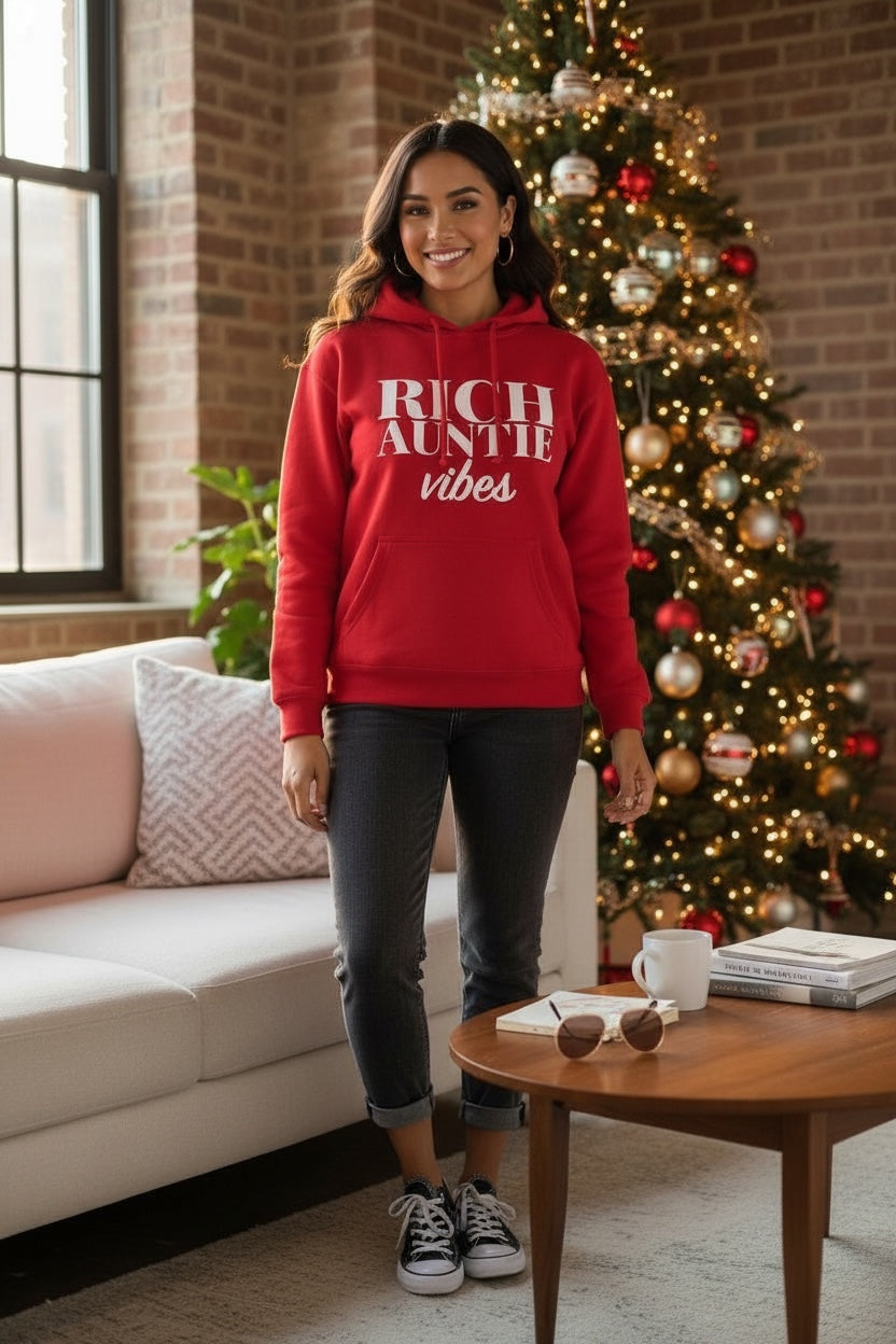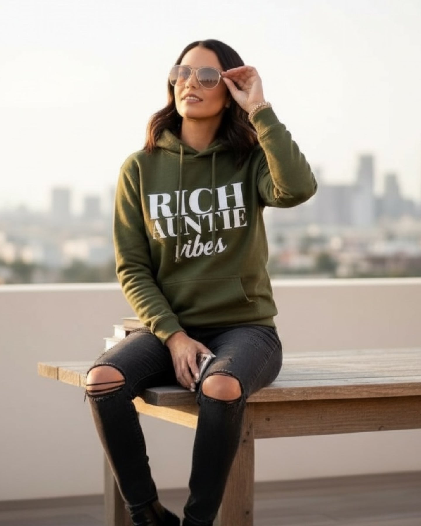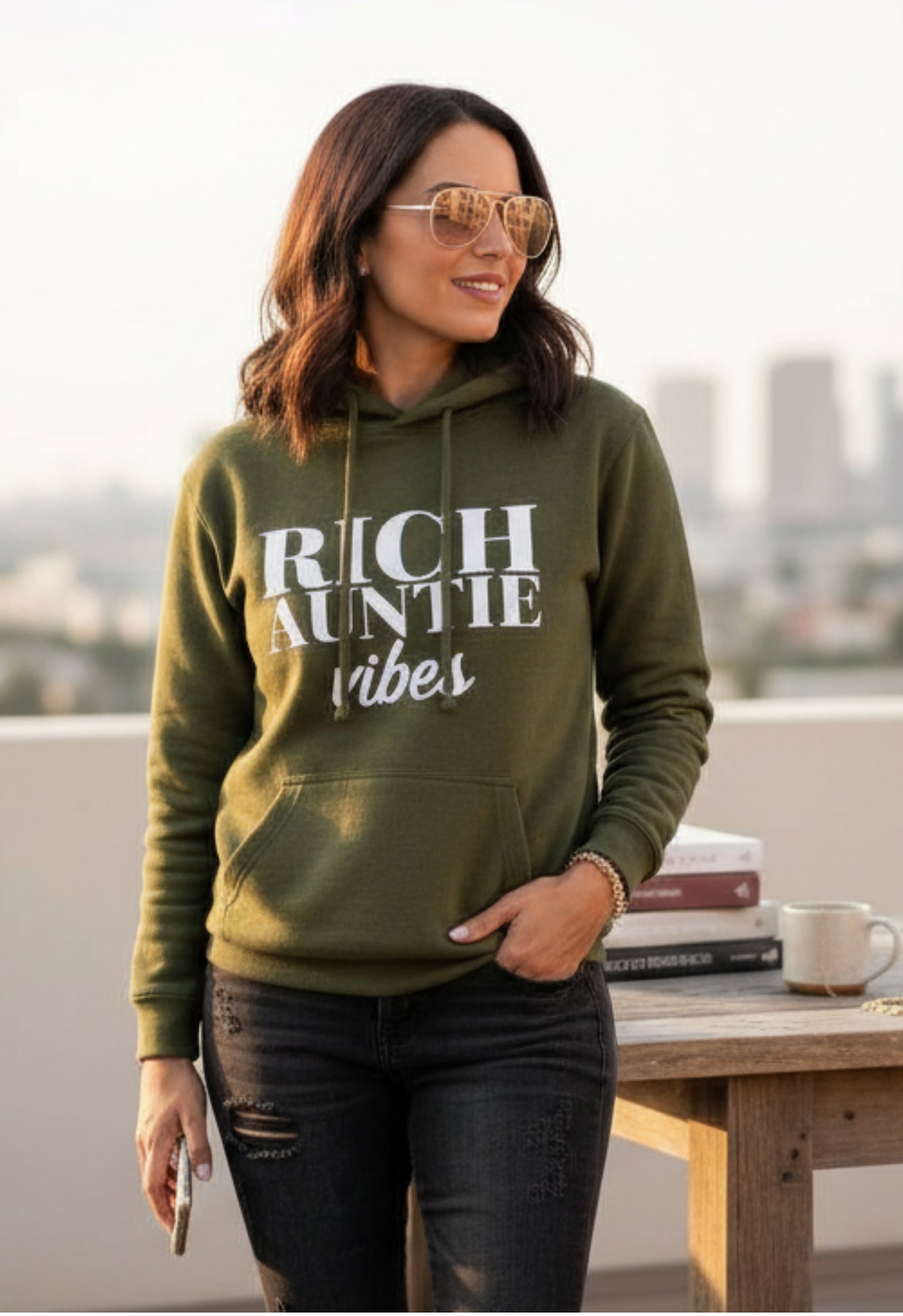 Introducing the Olive Rich Auntie Hoodie, a stylish and comfortable French terry fleece pullover made to order with a blend of 80% cotton and 20% polyester. Imported and printed in the USA, this label offers both quality and chic vibes. Stay warm and on-trend with this must-have piece.