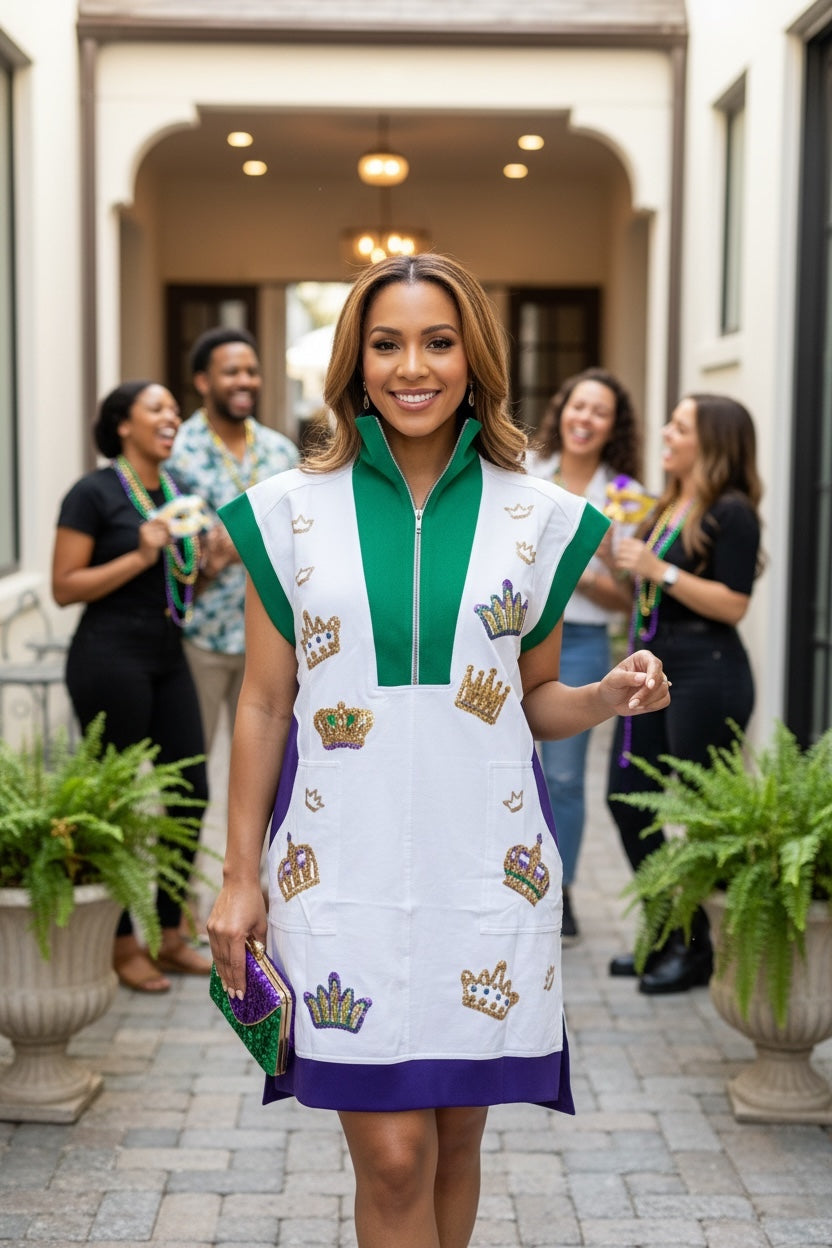 Elevate your Mardi Gras attire with this colorblock half zip dress, featuring a unique allover design of assorted crowns. Plus it offers versatility for layering over leggings or wearing alone. Available in sizes S/M through 2XL/3XL for a playful yet stylish look.