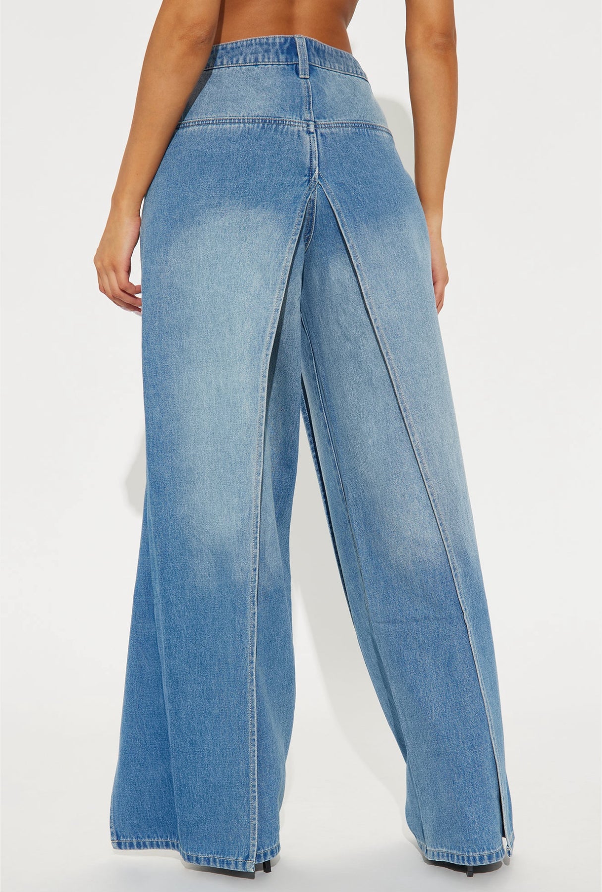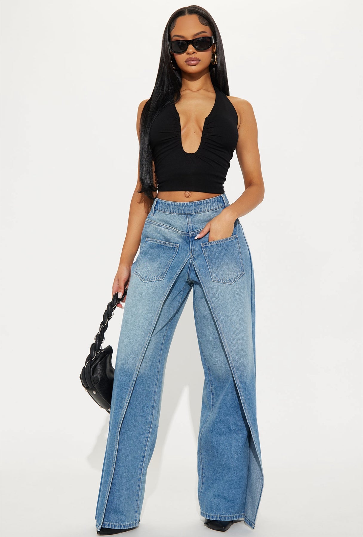 Upgrade your denim game with our undecided Wide Leg Jeans. The medium wash and wide leg style offer a classic look, while the front pockets and flap overlay add functionality.